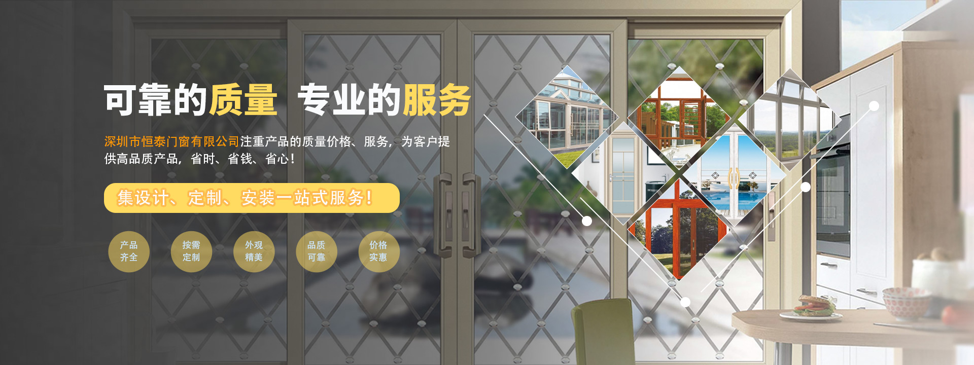 深圳市恒泰門窗有限公司(簡稱:恒泰門窗)是一家從事鈦鎂鋁合金智能門窗研發、生產、銷售為一體的綜合性企業。公司引進先進設備技術,吸取家居行業生產、管理經驗,靈活選擇適合本企業實際的生產工藝和管理模式,并擁有大批杰出的研發與管理專業人才,保證工藝技術的先進性和可靠性。 公司利用木紋鋁材、氟碳鋁材,金屬色鋁材及日本的電泳鋁材所生產的智能門窗,防水性能好、耐腐蝕性強、不變形、不褪色、款式新穎等特點,是現...